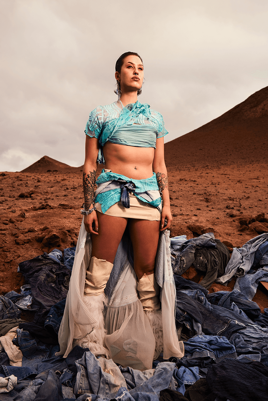 Unlike conventional fashion shows, Atacama Fashion Week reimagines the runway itself. Discarded garments recovered from the desert are transformed into creative statements, with the landscape becoming the catwalk. The collection was designed and constructed by Brazilian stylist Maya Ramos, who drew inspiration from the four elements — earth, fire, air, and water — linking each to a form of pollution and environmental harm.